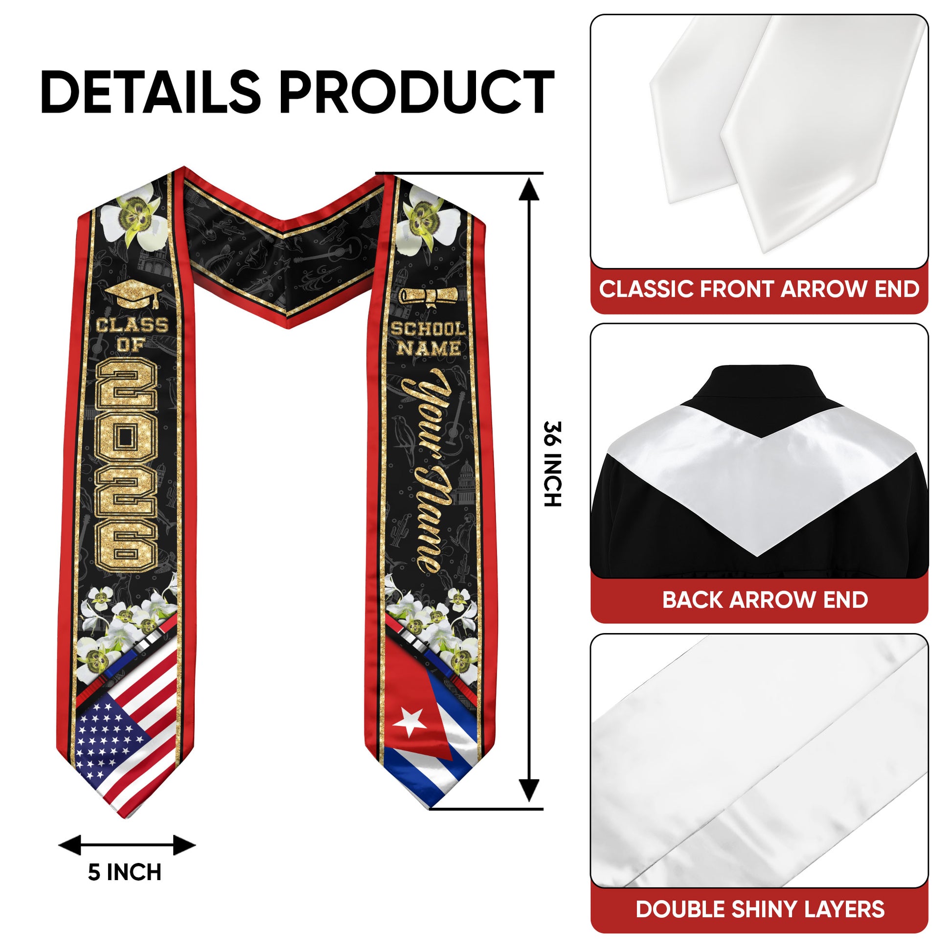 Cuba Graduation Stole 2026, Cuban Flag Sash, Custom Accent Graduation Stole for Class of 2026