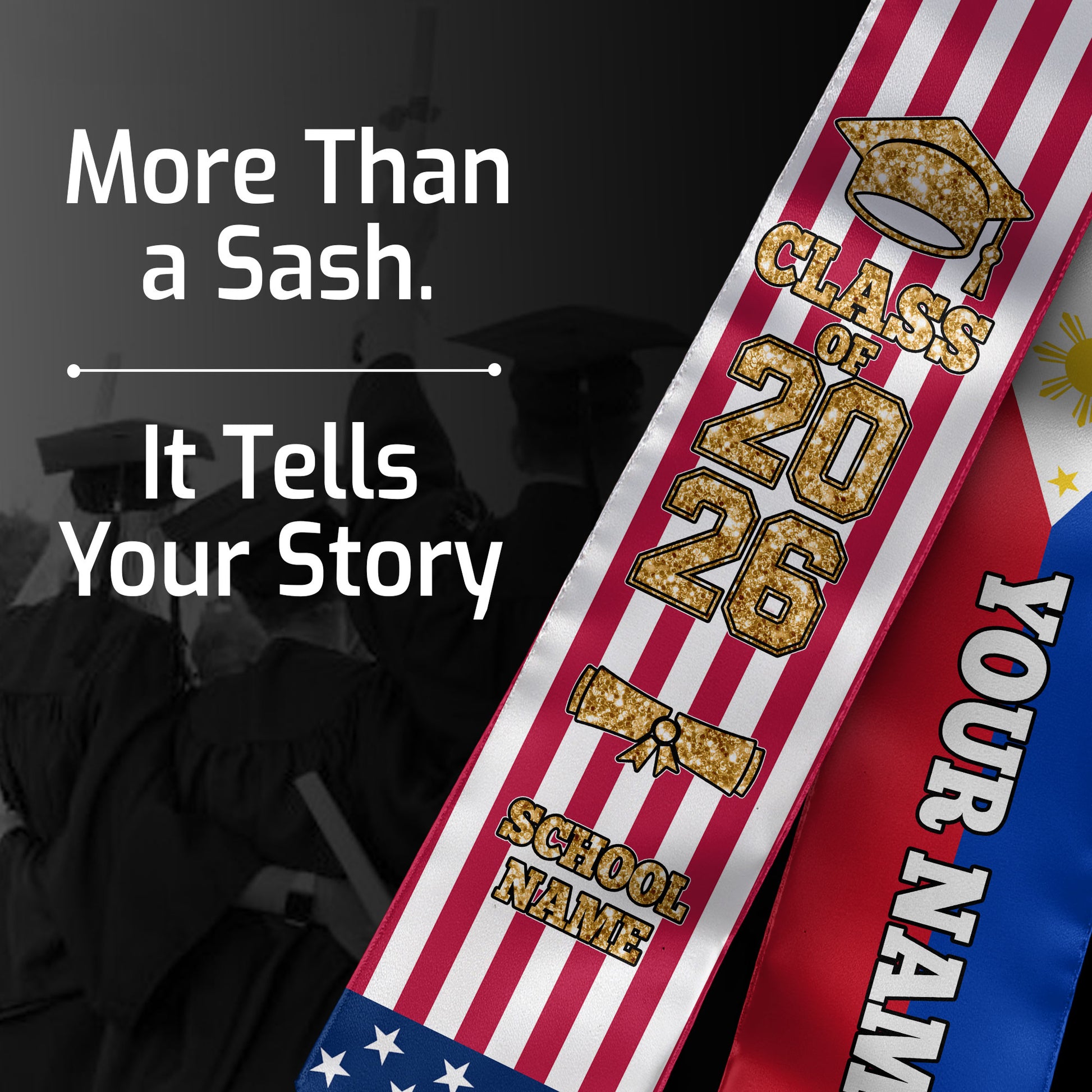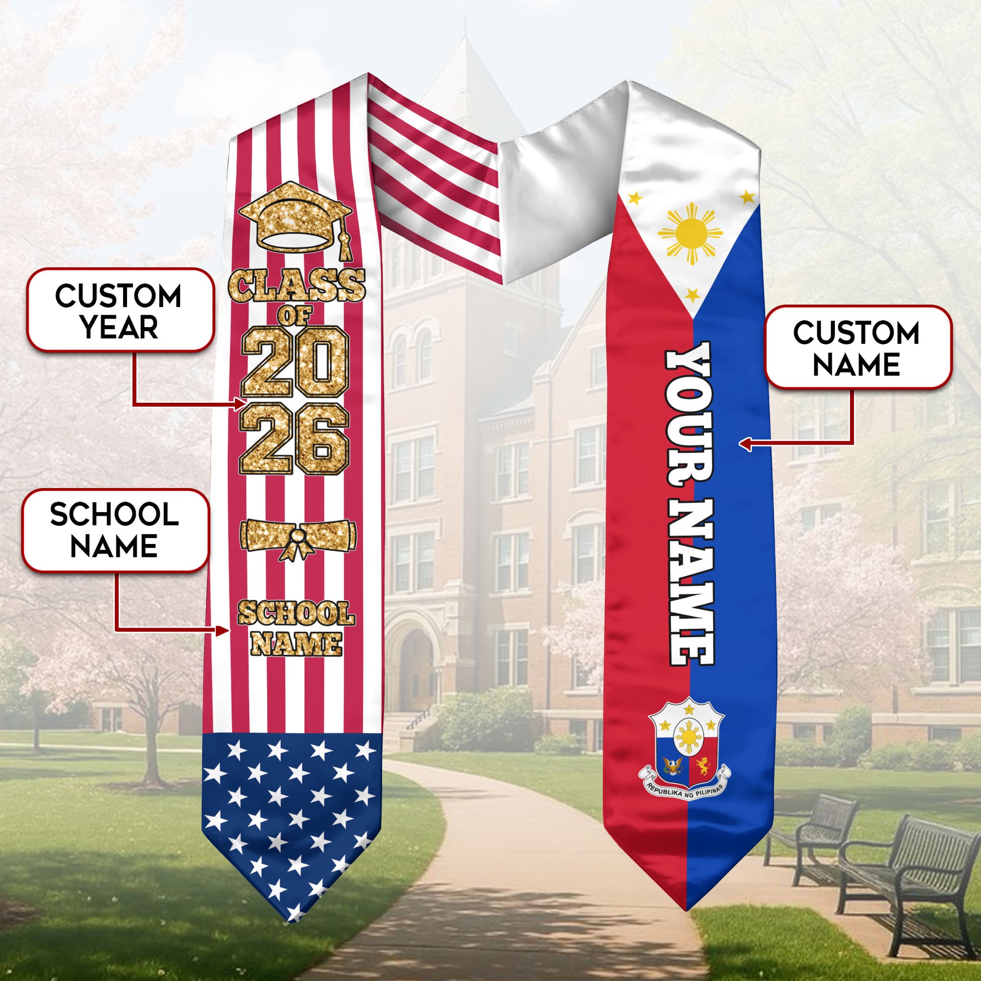 Customized Philippines Graduation Stole with Filipino Flag Feature, Graduation Sash 2026, Class of 2026