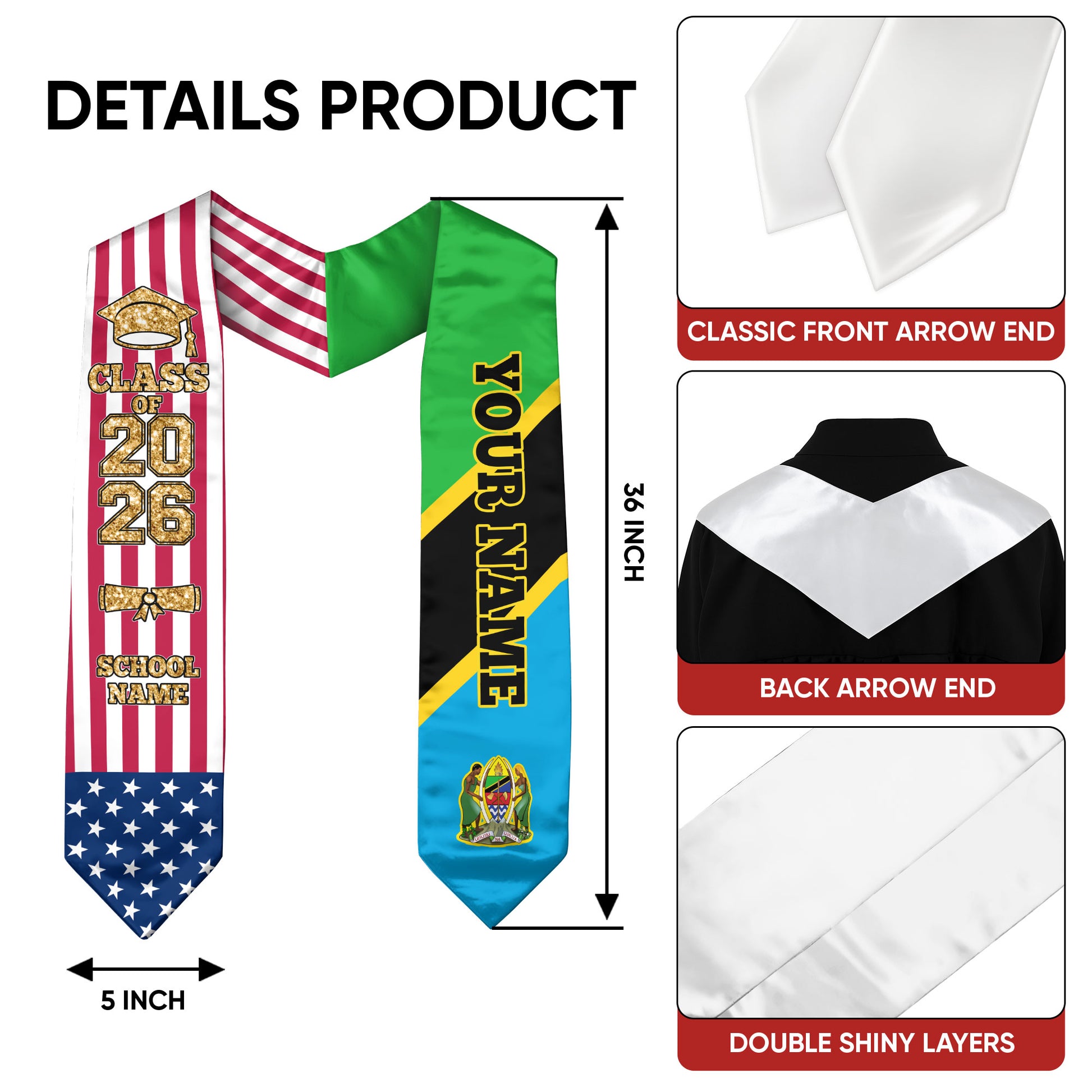 Customized Tanzania Graduation Stole Featuring National Flag Accent, Graduation Sash 2026, Class of 2026